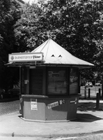 In der Platzmitte gelegener, kleiner polygonaler Kunststeinbau mit leicht konischem Sockel und geknicktem, weit überstehendem Zeltdach; Entwurf von August Buxbaum (Stadtbauamt). Er ist der einzig erhaltene von sieben identischen, 1925 an prominenten Stellen im Stadtgebiet errichteten Verkaufskiosken.
