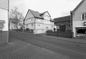 Wohnhaus einer dreiseitigen Hofanlage an der Kreuzung von Korbacher Straße und Oberer Mühlenweg. Das zweigeschossige Wohnhaus mit mittigem Zwerchhaus über dem hofseitigen Eingangsbereich ist vollständig verkleidet. Aufgrund des Geschossüberstands, der sich trotz Verkleidung abzeichnet, und der Proportionen des Gebäudes dürfte es in der Mitte des 18. Jahrhunderts errichtet worden sein. Da die Fensteröffnungen zum großen Teil vergrößert wurden, ist das Fachwerkgefüge ebenfalls verändert. Die hohe Sockelzone, die als Stall diente, ist verputzt. Der Eingangsbereich ist an originaler Position erhalten.