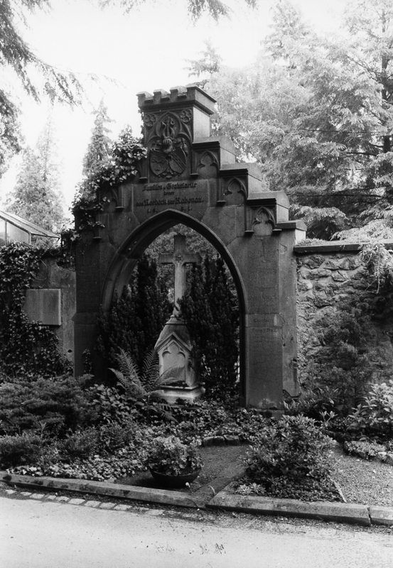 Der offene Torbogen mit Treppengiebel besteht aus dem in Darmstadt sehr selten benutzten, dunklen Eifeler Lavatuff. Unter dem turmähnlichen Grabmonument steht ein weißes, verziertes Sandsteinkreuz auf einem Sockel.