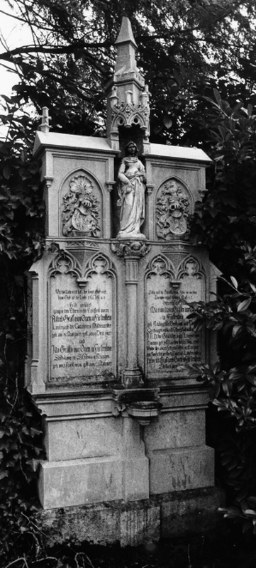 Der Grabstein aus Muschelkalk stammt wahrscheinlich aus dem Jahr 1835. Zierstück des zweiseitigen, altarähnlichen Monumentes ist eine Marienfigur aus Marmor auf einer kleinen Säule. Im oberen Bereich, über den Schrifttafeln, sitzen die Wappensteine der Familie.