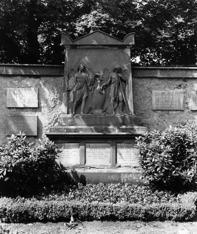 Johann Baptist Scholl schuf d.Ä. dieses Grabrelief aus gelbem Sandstein im Jahre 1830. Das Grab ist die letzte Ruhestätte Heinrich Emanuel Mercks (1794-1855), dem Apotheker und Gründer der heutigen Firma Merck. Scholl bildete einen Stein mit zwei klassizistisch gestalteten Engelsfiguren und einer antiken Amphore. Der Stein steht auf einem Sockel, in den drei Namenstafeln eingelassen sind.