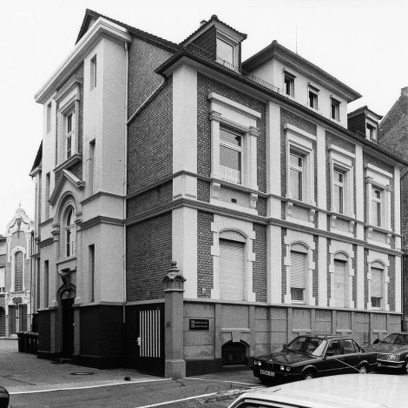 Wohnhaus und Büro des Bauunternehmens Wilhelm Ganss. Vorderhaus von 1894/95 mit historisierender Fassade in gelbem Klinker und Sandsteindekor; nach Bombenschäden niedriger Wiederaufbau.