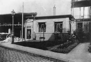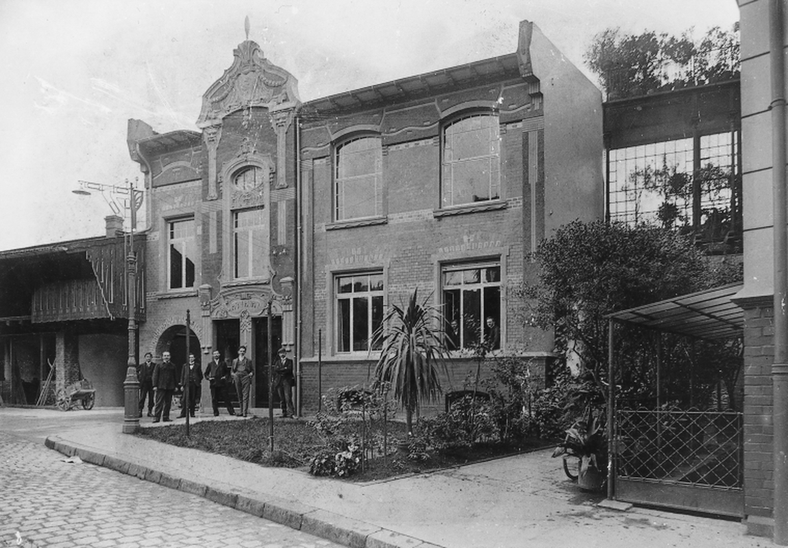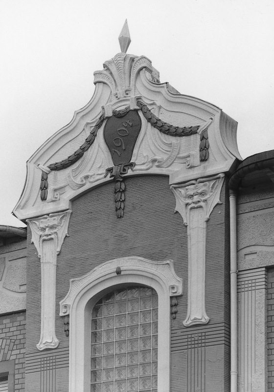 Zweigeschossiges Hintergebäude - Erweiterung eines gründerzeitlichen Kerns - 1904 von Carl Zimmer. Dabei zeitgemäße Neugestaltung der Fassade mit jugendstiliger Putzornamentik und Stuckdekor im Risalit. Der Zusammenarbeit mit Olbrich an der "Dreihäusergruppe" entstammen die dekorativen blauglasierten Klinker.