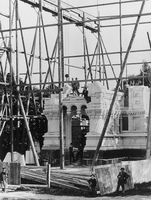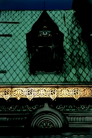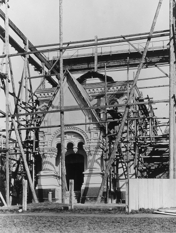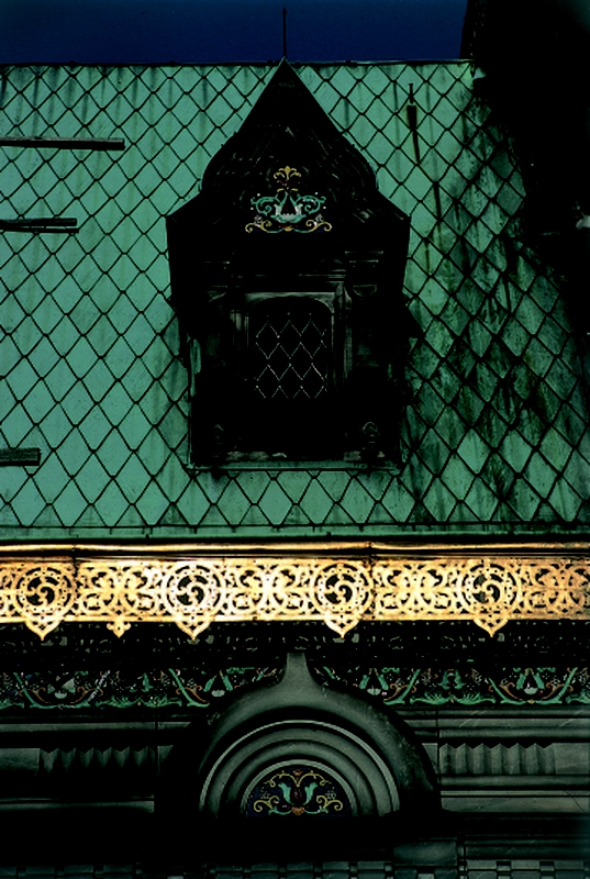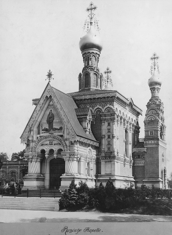 Bauherr der 1897-99 im großherzoglichen Park auf der Mathildenhöhe anstelle eines Gartenhauses errichteten russisch-orthodoxen Kapelle war Zar Nikolaus II. - Schwager des Großherzogs Ernst Ludwig. Der Architekt sowie die beteiligten Künstler kamen aus Rußland, Bauleiter und ausführende Firmen aus Darmstadt. Der russische Kirchenbaustil des 16. Jahrhunderts diente dem Petersburger Architekten und KirchenbaumeisterLeontij Nikolajewitsch (Louis) Benois als Vorbild für seinen prunkvollen, durch drei vergoldete Turmhauben weithin sichtbaren Sakralbau. Ausführende Architekten waren Gustav Jacobi und Friedrich Ollerich, Baufirmen u. a. Riedlinger für die Maurer-, Emmel für die Schlosser- und Glückert für die Schreinerarbeiten. Auf kreuzförmigem Grundriß erhebt sich mit Vorhalle, überkuppeltem Mittelbau, Querhaus und Chor ein in der Höhe gestaffelter Baukörper, dessen Massigkeit und Schwere jedoch durch die schlanken Türme etwas abgemildert wird.