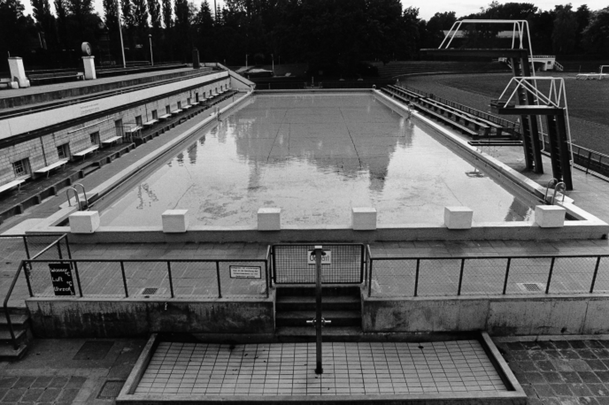 Das Schwimmbecken ist komplett aus Beton und lediglich gestrichen, die Startblöcke ebenso. Fliesen wurden damals nicht verwendet.