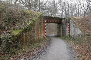 Eisenbahnbrücke der Odenwaldbahn zur Überbrückung des im spitzen Winkel zur Bahnlinie verlaufenden Schnampelwegs erbaut um 1870. Die Böschung der hochliegenden Eisenbahntrasse ist durch Stützmauern eingefasst, die konisch auf den Durchgang zulaufen. Die gemauerte Konstruktion und die Mauerabdeckungen bestehen aus roten Sandsteinquadern. Die eigentliche Bahnüberführung besteht aus einer einfachen geraden Betonkonstruktion, die vermutlich aus späterer Zeit stammt.