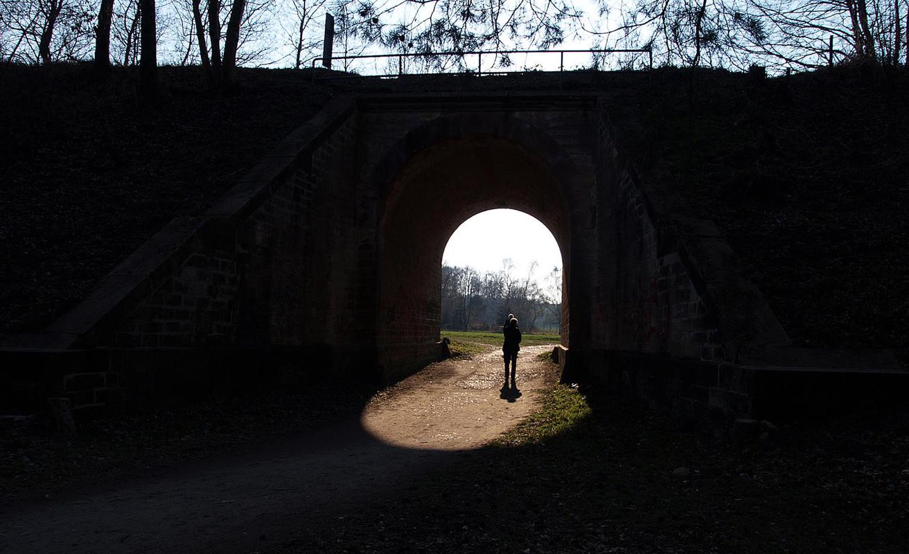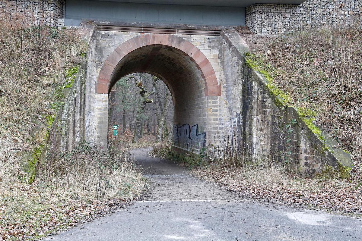 Rundbogige Eisenbahnbrücke der Odenwaldbahn zur Überbrückung der Brückenschneise erbaut um 1870. Die gemauerte Konstruktion besteht aus gelben und roten Sandsteinquadern. Die Böschung der hochliegenden Eisenbahntrasse ist durch Stützmauern eingefasst, die konisch auf den Durchgang zulaufen. Einziger Bauschmuck ist der profilierte Querträger über dem Rundbogen.