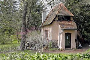 Im Garten steht ein heute noch genutztes eingeschossiges Gärtnerhäuschen in traditionell-heimatlicher Bauweise. Es ist ein Mauerwerksbau auf hohem, sichtbar gelassenen Bruchsteinsockel mit verputzten Wänden. Das steile Krüppelwalmdach ist mit Biberschwanzziegeln eingedeckt. Die dreifach gekuppelten gesprossten Holzfenster haben eine kräftige, seitlich unterbrochene Rahmung aus Sandstein. Der Zugang erfolgt über einen pultdachgedeckten Vorbau an der Stirnseite, über dem ein doppelt gekuppeltes Fenster in Fachwerkrahmung den Spitzboden belichtet.