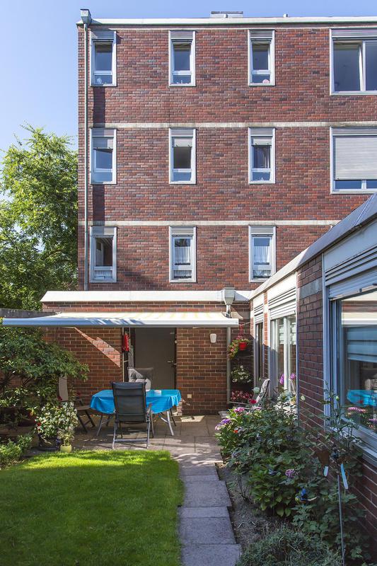 Rückseitig entwickelt das Gebäude mit weit auskragenden terrassenartigen Balkonen und einer in den Baukörper eingeschnittenen Dachterrasse einen sich öffnenden Charakter von hoher Wohnqualität. Auch hier ist die Verwendung von Rohaluminium für Geländerbrüstungen und Fenster dominant und kontrastiert farblich mit den roten Klinkern. Um die Geschlossenheit des Baukörpers zu erhalten, wird die Dachterrasse baulich durch einen Betonbügel in der Form des Dachrandes gefasst.