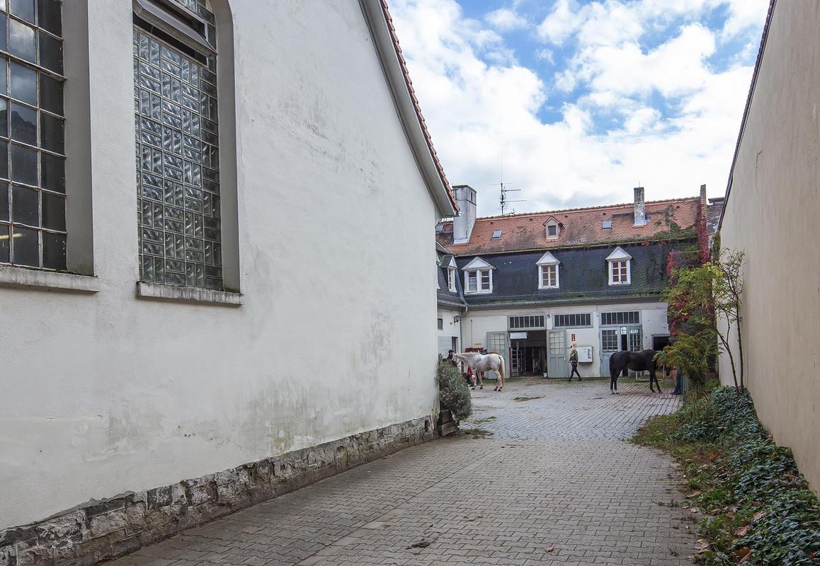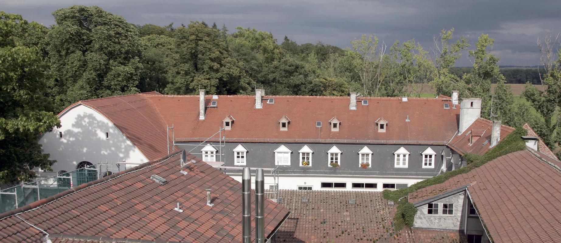 Südlich im Anschluss an die Halle befinden sich die Stallungen und die dazugehörigen Versorgungsräume. Von hier aus gelangt man in das Dachgeschoss, in dem sich die Zimmer für die Bediensteten befanden. Dieser eingeschossige Längsriegel hat ein Mansarddach, dessen unterer Teil mit Schiefer und der obere mit naturroten Biberschwanzziegeln gedeckt ist.