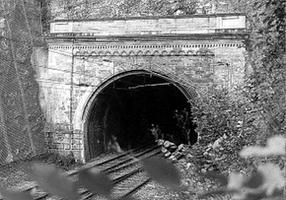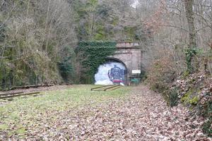 Tunnel im Nordwesten Richtung Eppstein, um 1911. Aufwendig ausgestaltete Tunnelköpfe, mit Sandsteinverblendung in Rustikaquaderung mit Werksteingliedern, Lisenen, Rundbogenfries, Gesims und Zahnfries. Im Zuge der Neugestaltung der Strecke und des Eppsteiner Bahnhofs bis 2016 Stilllegung.