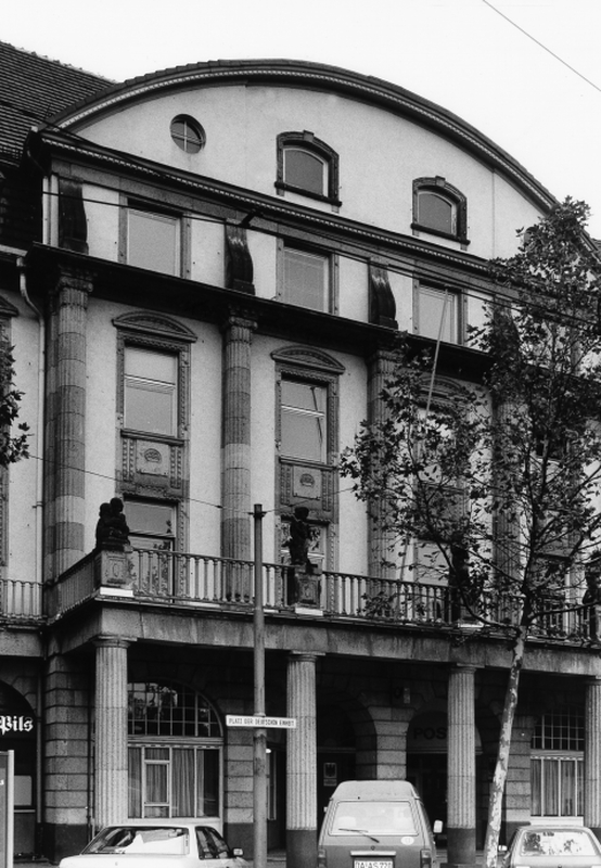 Wegen fehlender Mittel und dem Ausbruch des Ersten Weltkrieges wurde der Bau des Zwischentraktes, der äußerlich den beiden Hotels angepaßt sein sollte, zunächst verschoben. Als Markwort und Seibert schließlich bauen konnten, in der Weimarer Zeit, war ihr Entwurf von 1912 stilistisch überholt. 1928 wurde die Zeile um ihren Mittelteil ergänzt, auch von Seibert, aber im neuen Stil.