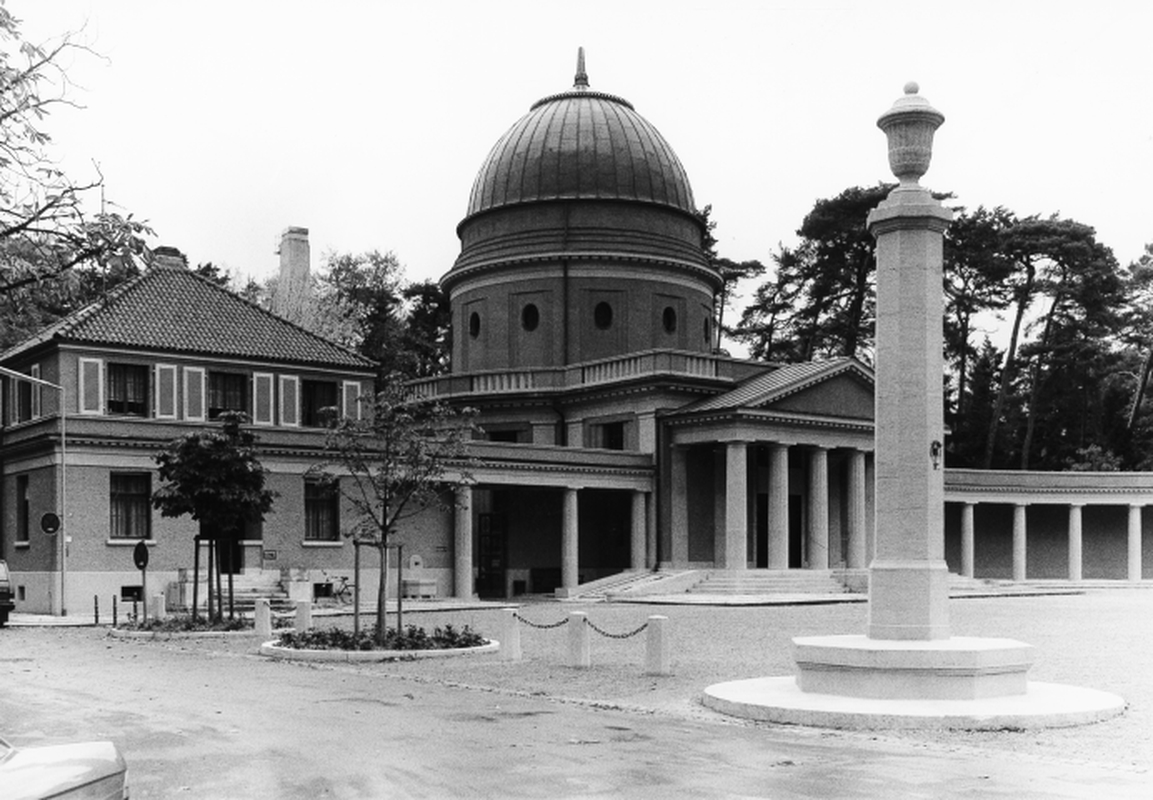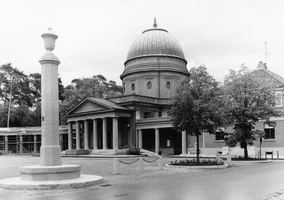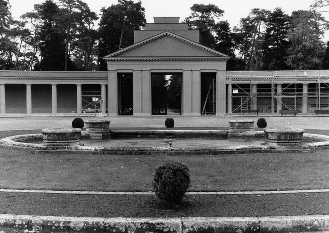 Die Architektur bildet einen repräsentativen Vorplatz aus, in dessen Zentrum sich eine von Säulen flankierte Brunnenanlage befindet.