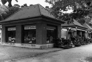 Auch die kleinen, ebenfalls symmetrisch angelegten und mit Biberschwanzziegeln gedeckten Geschäftspavillons in der Achse südlich des Vorplatzes gehören zum bauzeitlichen Bestand. Die mit Toren und Pergolen verbundenen Geschäftsräume für die Anbieter von Grabschmuck und Grabsteinen sind typisch für die Bauzeit und stilistisch, ebenso wie Wohn- und Verwaltungsgebäude, dem Traditionalismus verpflichtet.