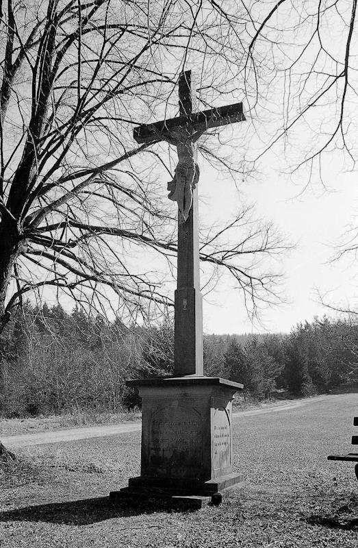 An der Gemarkungsgrenze auf einer Anhöhe an der Straße nach Ketten aufgestelltes Steinkruzifix, das im Jahre 1874 von der ortsansässigen Familie Dehler gestiftet wurde.Das kräftige Postament mit abgesetzter Basis und überstehender gekehlter Abschlussplatte weist an den Seiten des Kubus Zierfelder mit Rundbogenabschluss und seitlichen Zwickeln auf. Darin befinden sich auf allen vier Seiten Inschriften. Der sich nach oben verjüngende Kreuzstamm zeigt im unteren Teil in einem schlichten Rahmen das Flachrelief eines Kelches. Der schlanke Korpus des Gekreuzigten ist eine gute, zeittypische Steinmetzarbeit.