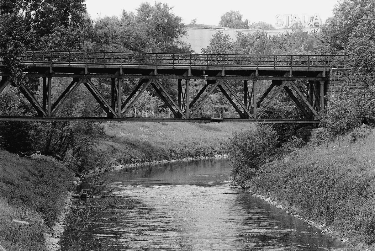 Unterspannter eiserner Gitterträger von 1908 über die Nidda auf Widerlagern aus Naturstein.