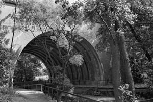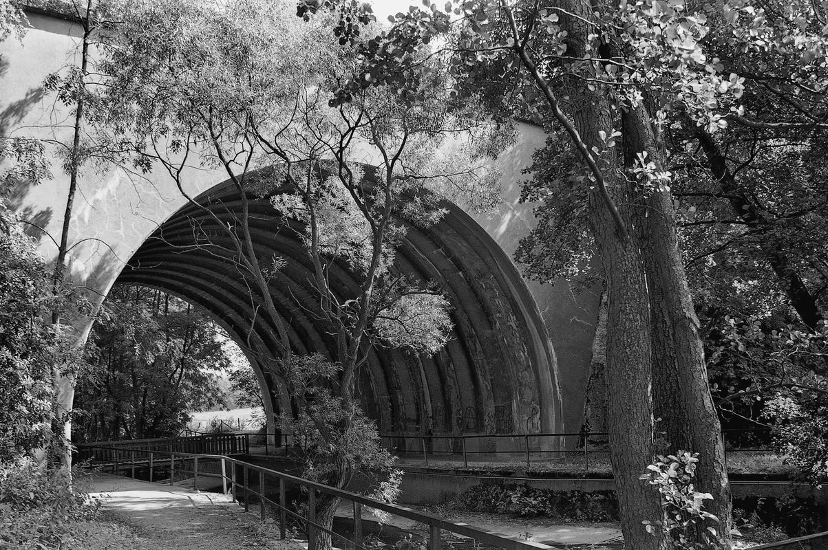 Dicht mit Gurten belegte Betontonne von 1915 über den Bach und seinen östlichen Uferweg.
