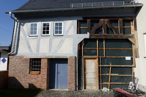 Die traufständige Scheune schließt den Hof nach Norden ab. Das Erdgeschoss ist ebenfalls massiv, zum Teil noch aus Bruchstein gemauert, das Obergeschoss und die Tordurchfahrt sind als einfache Fachwerkkonstruktion mit doppelt geschweiften Streben über dem Tor gestaltet.
