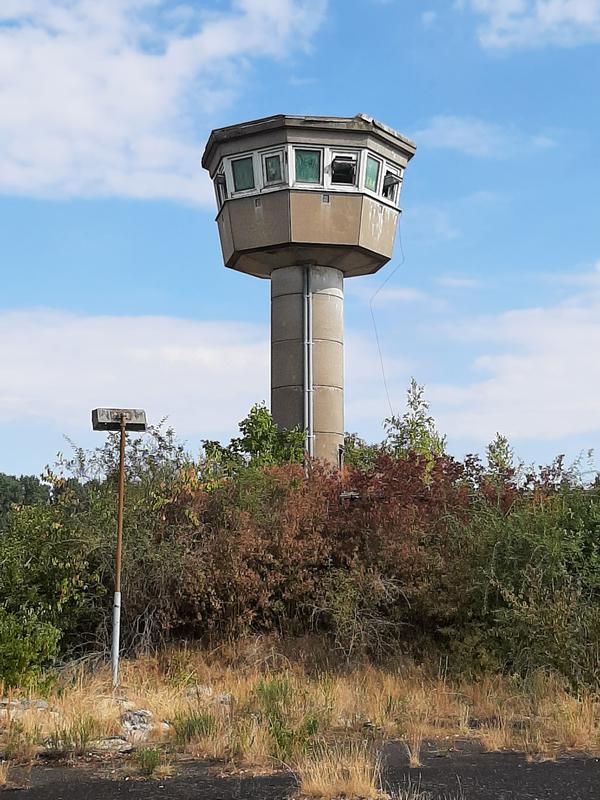 Der markante, weithin sichtbare Wachturm aus Beton schließt an die westliche Schmalseite des Hauptgebäudes an. Erschlossen wird er über eine Stahlwendeltreppe im Inneren des Turmschaftes, die über das Hauptgebäude erreicht wird. Die achteckige Beobachtungsplattform ermöglicht einen Rundumblick über das gesamte Areal sowie die weitere Umgebung und ist mit schusssicheren Scheiben gesichert, die sich über einen Kippmechanismus öffnen lassen. Die Plattform verfügt zu allen Seiten über Schießscharten, die sich mithilfe schwerer Stahlklappen schließen und öffnen lassen.