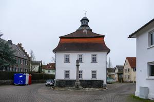 Auf der Westseite des ehemaligen Schul- und Rathausgebäudes befindet sich ein Denkmal für die Gefallenen des Ersten und Zweiten Weltkrieges. Die als Halbrund angelegte Gedenkstätte war ursprünglich durch eine niedrige Sockelmauer eingefasst. Dies ist durch das mittlerweile erhöhte Straßenniveau jedoch nur noch andeutungsweise zu erkennen. Die zentral aufragende, achteckige Säule aus Muschelkalk wird bekrönt von einer Adlerskulptur. Die Inschrift auf dem Säulenschaft „Gedenket der Gefallenen 1914-1918“ wird ergänzt durch die Gefallenenliste auf der achteckigen Säulenbasis.