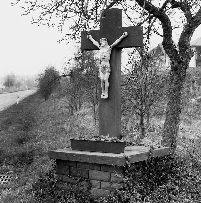 Das Kreuz nördlich des Ortes dürfte aus der Zeit um 1960 stammen, während der gußeiserne Corpus älter ist. Es steht an der L3134 (Hauptstraße), die die historische Geleitstraßen nach Griedel, beziehungsweise nach Dorfgill/Gambach nachzeichnet.